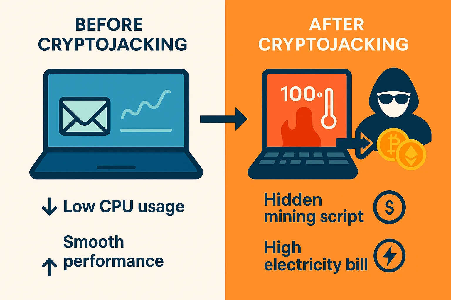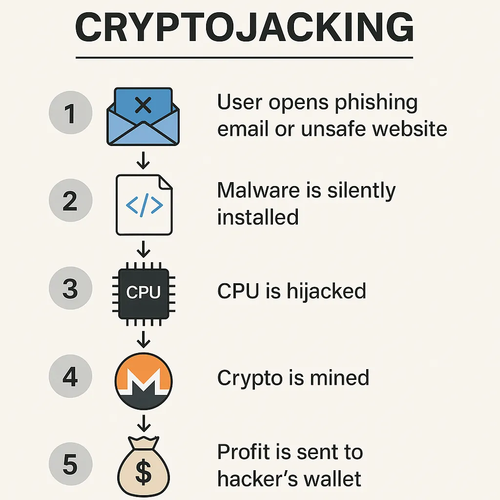 Cryptojacking is the unauthorized use of someone’s device — computer, phone, or even IoT gadget — to mine cryptocurrency. Instead of breaking into your bank, hackers hijack your CPU or GPU to generate coins like Monero, using your electricity and computing power while you pay the bill.