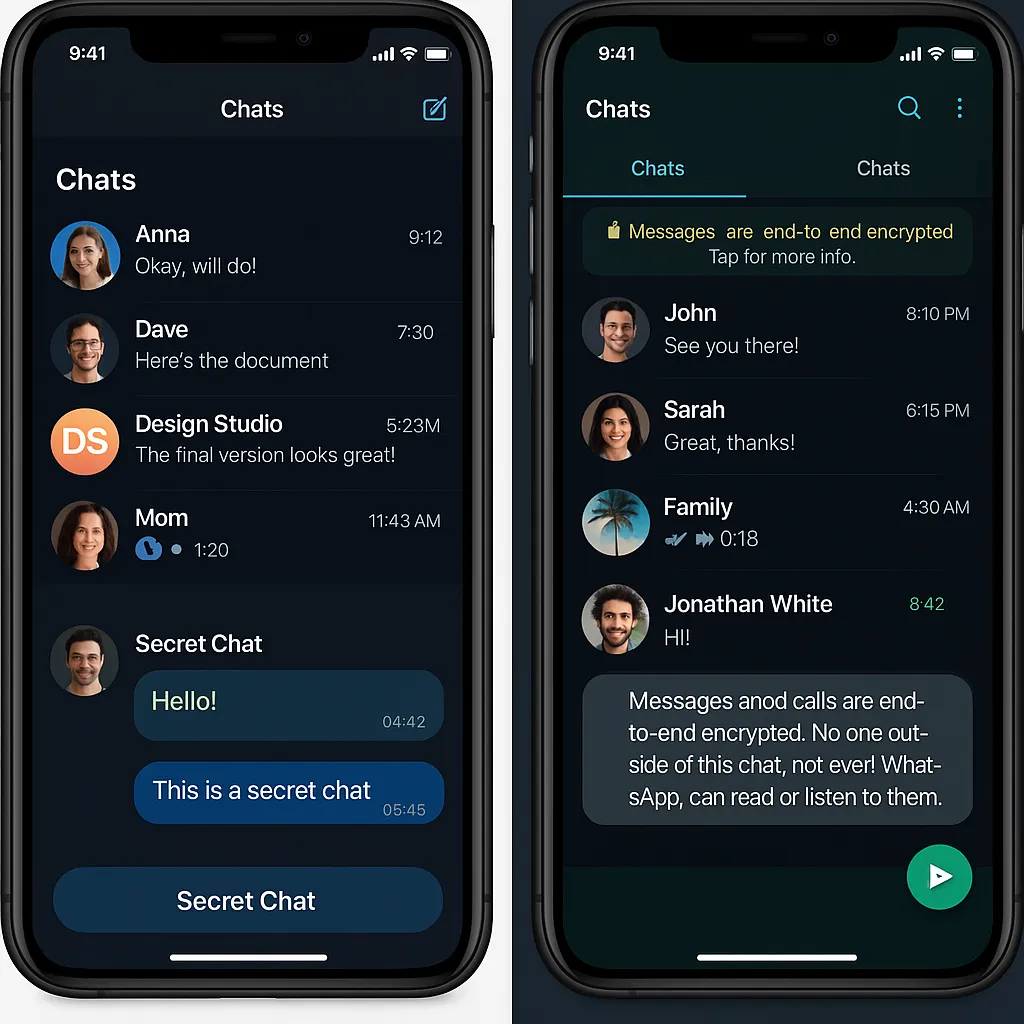 Together, these interfaces reflect the core values of each app: Telegram empowers, WhatsApp protects quietly.
