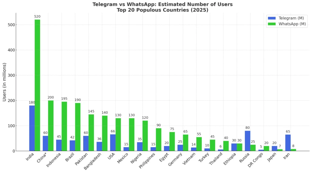 Telegram vs WhatsApp: Global Usage in the 20 Most Populous Countries (2025)